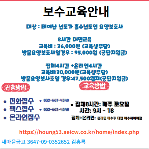 방문요양보호사일 경우 이수증을 기관에 제출해주시면 47.500원 보수교육비를 받습니다.